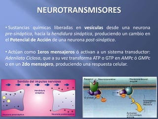 El documento trata sobre conceptos de neuroanatomía. Resume que las neuronas autonómicas tienen una primera neurona pre-ganglionar en el SNC y una segunda post-ganglionar en un ganglio. También describe la síntesis de catecolaminas como la dopamina y norepinefrina a partir del aminoácido tirosina. Finalmente, explica que la dopamina funciona como neurotransmisor en diversas regiones cerebrales.