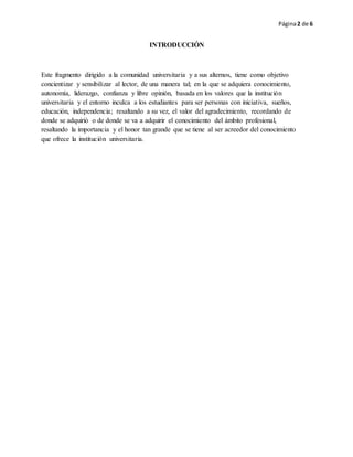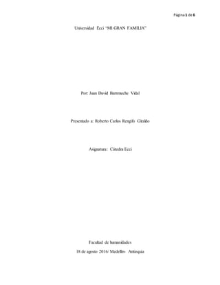 Este documento presenta un ensayo titulado "Mi gran familia" que destaca la importancia de la universidad Ecci y el sentido de pertenencia a la institución. El autor introduce el tema y explica que el ensayo busca concientizar a los estudiantes sobre los valores que la universidad inculca como la iniciativa, los sueños y la educación. Luego desarrolla que la adaptación a una nueva forma de adquirir conocimiento es la misión de la universidad y genera en los estudiantes el deseo de pertenecer a la institución. Final