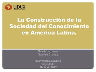 El documento describe el origen y desarrollo de la sociedad del conocimiento en América Latina. Explica que surgió en Europa durante los siglos XIX y XX, centrándose en el conocimiento como motor de progreso. Sin embargo, tuvo dificultades para establecerse en América Latina debido a que la aristocracia se enfocó sólo en el comercio y no vinculó el conocimiento con el desarrollo. Además, la falta de inversión en investigación y educación superior generó una fuga de cerebros hacia países desarrollados