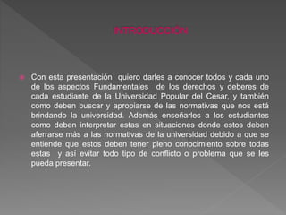 Este documento resume los aspectos fundamentales de los derechos y deberes de los estudiantes de la Universidad Popular del Cesar según su reglamento institucional. Explica que el reglamento define el código de conducta que deben seguir estudiantes y profesores, incluyendo normas de comportamiento, uniforme y horario. También describe algunos de los procedimientos específicos relacionados con solicitar traslados de carrera, cometer fraude académico y las posibles sanciones por infracciones. El autor concluye que conocer el reg