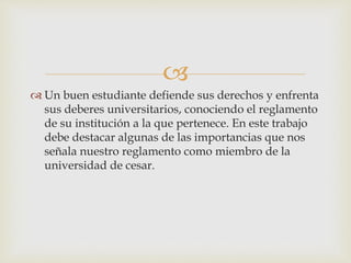Este documento resume los aspectos clave del reglamento institucional de la Universidad Popular del Cesar (UPC) en Colombia. Explica que el reglamento establece normas obligatorias para regular el comportamiento de estudiantes y personal, y define procedimientos como las transferencias entre programas y sanciones por faltas. También enumera algunos derechos de los estudiantes como participar en organismos universitarios y recibir servicios de bienestar.