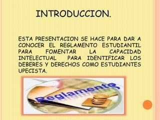 Este documento presenta la importancia del reglamento estudiantil para los estudiantes de la Universidad UPECISTA. Explica que el reglamento establece normas para regular las actividades de los estudiantes y promover una sana convivencia. También describe algunos casos en los que se debe aplicar el reglamento, como fraude en exámenes, agresión física a profesores o compañeros, y pérdida de semestres. El documento concluye que conocer el reglamento es fundamental para que los estudiantes sepan las normas y