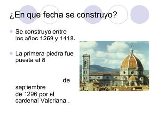 La Catedral de Florencia se construyó entre 1269 y 1418, siendo puesta la primera piedra en 1296. Fue diseñada originalmente por Arnolfo di Cambio y contó con la participación de varios arquitectos a lo largo de su construcción, siendo el más importante Filippo Brunelleschi, quien completó la gran cúpula de madera. Dentro de la catedral sobresalen sus vitrales, el piso de mármol y obras de arte de importantes artistas como Donatello, Luca della Robbia y Paolo Uccello.
