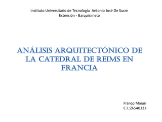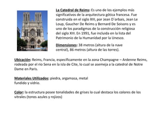 La Catedral de Reims es uno de los ejemplos más significativos de la arquitectura gótica francesa, construida en el siglo XIII. Es notable por su gran altura, vitrales de colores y tres portadas decoradas con esculturas. Fue incluida en la lista del Patrimonio de la Humanidad por la UNESCO en 1991.