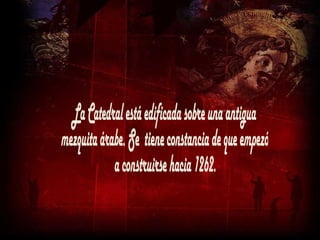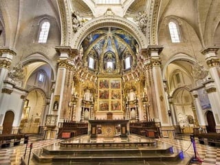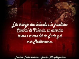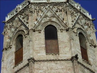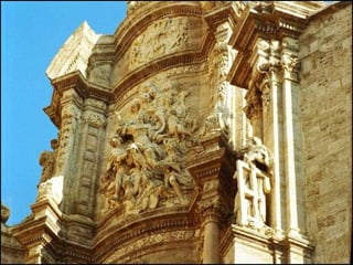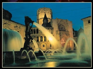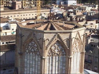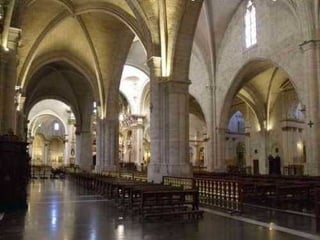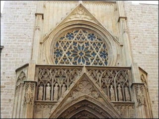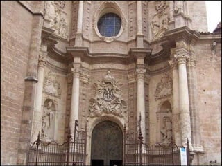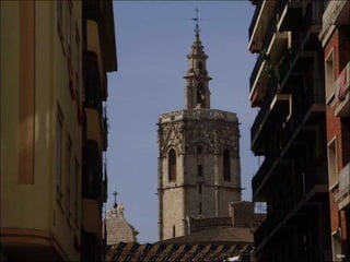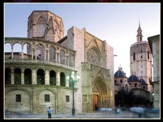 La catedral de Valencia está dedicada a Santa María y fue construida en estilo gótico mediterráneo aunque contiene elementos de otros estilos. Alberga reliquias importantes como el Santo Cáliz del siglo I y posee varias puertas y capillas, incluyendo la puerta de Los Apóstoles y la capilla del Santo Cáliz. El campanario Miguelete es otro elemento destacado de la catedral.