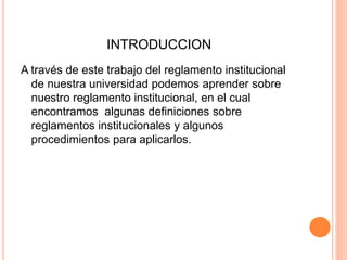 Este documento resume el reglamento estudiantil de la Universidad Popular del Cesar. Explica que un reglamento institucional es un conjunto de reglas que establecen un comportamiento adecuado. Detalla algunas normas como los procedimientos para cambiar de programa, qué sucede cuando un estudiante hace fraude en un examen, y los tipos de sanciones para agredir a otros. Concluye que conocer el reglamento permite a los estudiantes saber las normas que deben seguir durante su carrera universitaria.