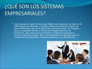 Este documento describe los sistemas empresariales y cómo estos sistemas pueden integrar diferentes funciones de una empresa como la producción, el almacenamiento, la distribución y los recursos humanos para mejorar la eficiencia operativa y proporcionar información a los gerentes. También describe cómo los sistemas de administración de la cadena de suministro y de relación con el cliente pueden usar la información para mejorar los procesos de una empresa y aumentar las ventas.