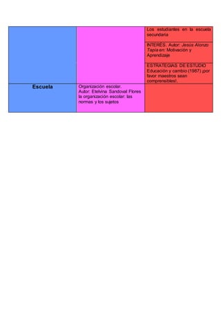 El documento presenta varios temas y subtemas relacionados con la enseñanza y el aprendizaje en la escuela secundaria, incluyendo las actitudes de los maestros, la organización del grupo, cómo aprenden los niños, el uso de recursos didácticos, la motivación en clase, la planeación, la participación de los alumnos, la diversidad del aula, y las estrategias de estudio.