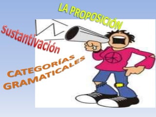 Este documento define y clasifica las principales categorías gramaticales del español: sustantivos, adjetivos, artículos, verbos, preposiciones, adverbios y conjunciones. Explica que los sustantivos nombran personas, animales u objetos y pueden ser propios, comunes, abstractos o concretos. Los adjetivos califican o determinan sustantivos y pueden ser demostrativos, posesivos o indefinidos. Los artículos delimitan el alcance de los sustantivos y pueden ser definidos o indefinidos.