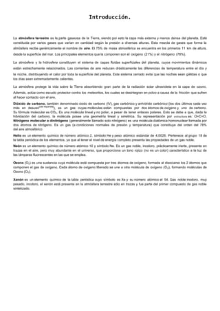 Este documento describe la composición de la atmósfera terrestre. Explica que la atmósfera está compuesta principalmente por nitrógeno (78%) y oxígeno (21%), además de pequeñas cantidades de gases como dióxido de carbono, helio, neón, ozono y xenón. También protege la vida absorbiendo radiación ultravioleta y desintegrando meteoritos. La conclusión es que es importante que los gases atmosféricos no reaccionen entre sí para mantener el equilibrio necesario para la vida en la Tierra.