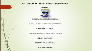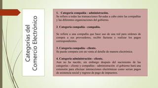 El documento describe cuatro categorías principales del comercio electrónico: 1) Categoría compañía - administración, 2) Categoría compañía - compañía, 3) Categoría compañía - cliente, 4) Categoría administración - cliente. Explica que la categoría administración-cliente se refiere a las transacciones entre personas y entidades del gobierno como pagos de impuestos o servicios sociales. También describe la categoría cliente-empresa como las transacciones entre personas y empresas privadas para compras, pagos y consultas bancarias.