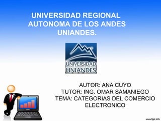 El documento describe las principales categorías del comercio electrónico, incluyendo empresa-empresa, empresa-consumidor, empresa-administración y consumidor-administración. La categoría empresa-empresa se refiere al intercambio electrónico de datos entre compañías, mientras que empresa-consumidor se refiere a la venta en línea de bienes a consumidores. La categoría empresa-administración cubre transacciones entre empresas y el gobierno.