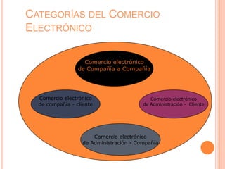 Este documento describe cuatro categorías del comercio electrónico: comercio electrónico de compañía a compañía, comercio electrónico de compañía a cliente, comercio electrónico de administración a compañía, y comercio electrónico de administración a cliente. Cada categoría se refiere a diferentes tipos de transacciones electrónicas entre empresas, gobiernos y clientes, como órdenes de compra entre compañías, ventas al por menor en línea, y futuras interacciones electrónicas entre gobiernos y ciudad