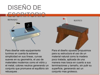 El documento presenta dos diseños de escritorio: uno refinado y otro rústico. El diseño refinado se caracteriza por su simplicidad, uso de materiales modernos como vidrio y metal, y colores neutros que promueven el equilibrio. El diseño rústico usa madera poco tratada de una manera tosca, sin pulir, dándole un aspecto más grotesco. Cada diseño se describe comparando diferentes categorías estéticas como liviano-pesado, blando-rígido, vibrante-sereno, etc.
