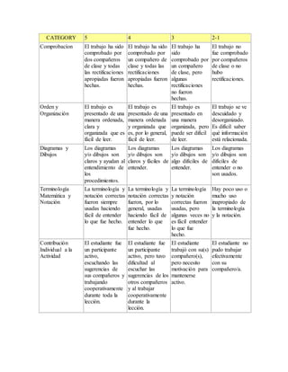 El documento presenta una tabla de evaluación para trabajo matemático. La tabla incluye categorías como comprobación por pares, organización, diagramas, terminología, razonamiento matemático, errores y conceptos. Se provee una descripción de nivel de desempeño para cada categoría en una escala de 5 a 1, donde 5 es el más alto nivel de desempeño.