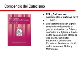 Este documento describe los siete sacramentos de la Iglesia Católica. Explica que los sacramentos son signos sensibles instituidos por Cristo que otorgan gracia divina. Los siete sacramentos son: Bautismo, Confirmación, Eucaristía, Penitencia, Unción de los enfermos, Orden y Matrimonio. Cristo confió los sacramentos a la Iglesia para santificar a los cristianos y construir el Cuerpo de Cristo.