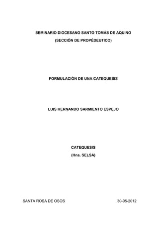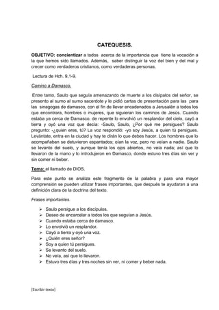 El documento presenta un resumen de una catequesis sobre el llamado de Dios a Saulo en el camino a Damasco según Hechos 9:1-9. Se destacan frases clave del pasaje, se analiza la doctrina central y se incluye un diagrama y preguntas para reflexionar sobre cómo reconocer la voz de Dios hoy.