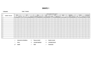 Este documento presenta la información de 7 catequistas divididos en 4 grupos, incluyendo sus nombres, edades, direcciones, teléfonos y correos electrónicos. Además, contiene tablas de asistencia mensual de cada catequista a distintas actividades religiosas como temas, adoración al Santísimo y jornadas espirituales durante el año 2012.