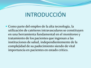 El documento resume la historia y uso de catéteres intravasculares. Comenzó con experimentos en 1900 y ha evolucionado gracias a innovaciones como nuevos materiales y recubrimientos. Actualmente, los catéteres venosos son una herramienta fundamental en el monitoreo y tratamiento de pacientes, especialmente los críticos, aunque deben usarse con cuidado para prevenir infecciones.