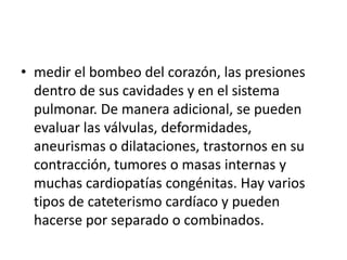 El cateterismo cardíaco permite evaluar las estructuras del corazón mediante la inserción de un catéter flexible en una vena o arteria. Se miden presiones, se toman muestras de sangre y se inyecta contraste para visualizar el flujo sanguíneo. Esto ayuda a diagnosticar enfermedades cardíacas y realizar procedimientos terapéuticos mínimamente invasivos.