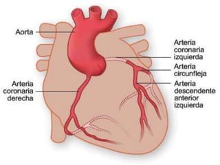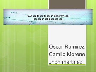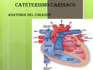 El documento describe el procedimiento de cateterismo cardiaco. Explica la anatomía del corazón y los objetivos e indicaciones del cateterismo como estudiar patologías cardiacas. Detalla los equipos utilizados como agujas, guías e introductores, y la técnica del procedimiento que incluye la punción de vasos, inserción de catéteres y toma de presiones.