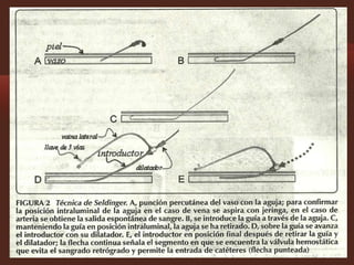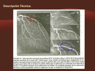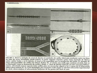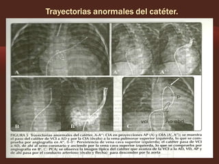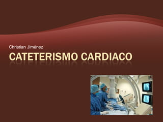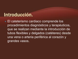 El cateterismo cardiaco comprende procedimientos diagnósticos y terapéuticos mediante la introducción de catéteres flexibles desde vasos sanguíneos al corazón. Se usa para diagnosticar y tratar enfermedades cardíacas de manera menos invasiva que la cirugía. Las complicaciones son ahora menores al 1.5% debido a nuevas técnicas y dispositivos como los stents y antiagregantes plaquetarios.