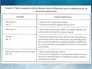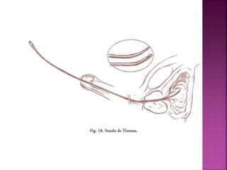 El documento describe diferentes tipos de catéteres y sus características, usos y complicaciones. Se mencionan catéteres cortos y largos, de Hickman, ureterales, epidurales y Swan-Ganz. Se explican detalles sobre la colocación y retiro de catéteres vesicales y su manejo. También se abordan conceptos generales sobre drenajes, materiales, tipos, mecanismos de funcionamiento y posibles complicaciones.