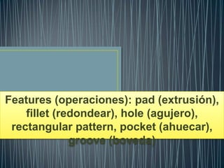 Este documento describe las características de una aplicación interactiva tridimensional asistida por gráficos de computadora que incluye operaciones como extrusión, redondear, agujero, patrón rectangular, ahuecar y boveda.