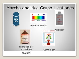 Este documento presenta los procedimientos analíticos para la identificación de cationes de plata, mercurio y plomo. Describe las reacciones químicas involucradas en la formación de precipitados de cloruro de plata, cloruro de mercurio y cloruro de plomo usando reactivos como ácido clorhídrico y nitrato de plata. También explica cómo se separan los cationes de plata y mercurio y cómo se identifican a través de reacciones con yoduro de potasio e hidruro