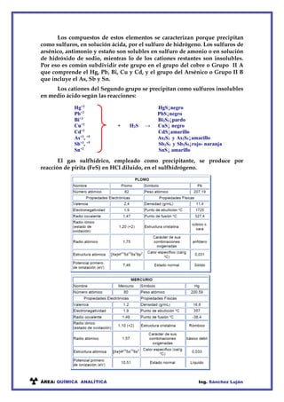 Este documento presenta las reacciones analíticas de los cationes del segundo grupo, incluyendo Pb2+, Hg2+, Cu3+, Bi3+, Cd2+, As3+, Sn2+ y Sb3+. Describe los materiales y reactivos utilizados, así como los procedimientos para identificar cada catión mediante la formación de precipitados característicos y sus respectivas ecuaciones iónicas y moleculares. Se enfoca principalmente en las reacciones del Hg2+, Cu2+ e incluye ejemplos de ecuaciones para ilustrar los cambios químicos