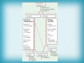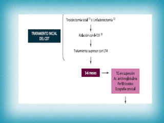 Este documento resume la información sobre tumores malignos de tiroides. Explica que los carcinomas papilares son los más comunes y tienen mejor pronóstico. También describe los factores de riesgo, clasificación TNM, etapas, diagnóstico, tratamiento con cirugía y yodo radiactivo, y seguimiento con tiroglobulina. Resalta que el pronóstico general es favorable pero depende del estadio y características del tumor.