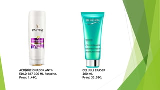 Este documento es un catálogo de productos de perfumería y cuidado personal con sus precios respectivos. Incluye artículos como acondicionadores, cremas, champús, colonias y maquillaje de marcas como Pantene, Paco Rabanne, Hugo Boss, Calvin Klein, Carolina Herrera y Lancome. Los precios van desde 0,97€ hasta 36,57€.