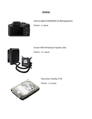El documento presenta una lista de productos electrónicos, electrodomésticos y accesorios para computadoras con sus respectivos precios, incluyendo cámaras, discos duros, gabinetes, heladeras, motherboards, teléfonos, tarjetas de video, televisores, procesadores y otros. Los precios van desde $42 hasta $32,000.