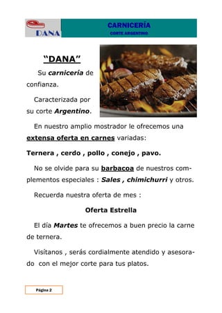 La carnicería "Dana" ofrece una amplia variedad de carnes como ternera, cerdo, pollo, conejo y pavo en su mostrador. Se especializa en el corte argentino de carne y también ofrece complementos como chimichurri y sales. Todos los martes tienen oferta especial de ternera a buen precio. El local está ubicado en varias calles y los clientes serán atendidos de manera cordial para asesorarlos sobre los mejores cortes.