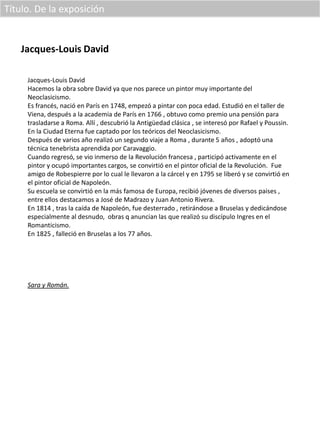 El documento presenta información sobre el pintor neoclásico Jacques-Louis David. Resume que David nació en París en 1748 y estudió en la Academia de París, ganando una pensión para estudiar en Roma donde descubrió el arte clásico. Más tarde se involucró activamente en la Revolución Francesa y se convirtió en el pintor oficial de Napoleón. Algunas de sus obras más famosas incluyen La muerte de Marat, La muerte de Sócrates y Retrato de Napoleón en su gabinete de trabajo.