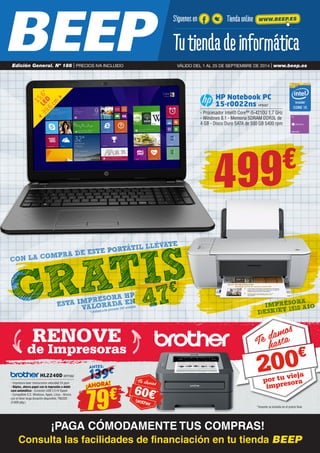 1) El documento es un catálogo de productos y precios de la tienda BEEP que incluye impresoras, portátiles, tablets, accesorios y otros dispositivos electrónicos. 2) Se proporcionan detalles como especificaciones, características y precios de venta de cada producto. 3) El documento también incluye ofertas y promociones, como dar dinero por una impresora usada o incluir accesorios gratis con algunas compras.