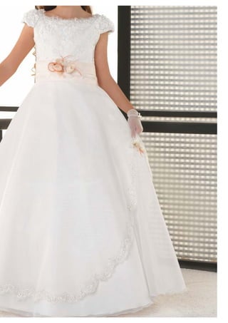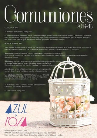 Este documento presenta la colección de vestidos y trajes para la Primera Comunión de 2015 de la tienda Azul y Rosa. Incluye descripciones e imágenes de numerosos vestidos y trajes para niñas, así como trajes para niños. También detalla los servicios de la tienda como pruebas de vestuario y horario extendido los sábados.