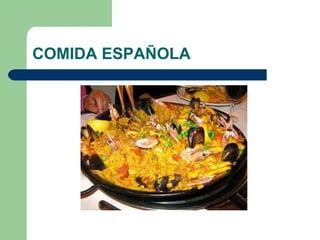El documento presenta un catálogo de comidas que incluye una variedad de platos de diferentes cocinas del mundo, como comida española, turca, china, griega, americana e italiana. Destacan opciones como chipirones a la plancha, doner kebap, gyoza, humus y pizza margherita, entre otros. El catálogo abarca una rica selección de opciones, desde tapas y ensaladas hasta postres tradicionales.