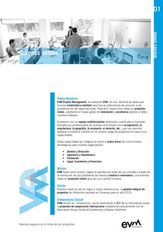 Este documento presenta un catálogo de cursos de gestión de proyectos ofrecidos por EVM Project Management. Incluye información sobre cuatro cursos principales de introducción a la gestión de proyectos, comunicación en proyectos, análisis del valor ganado (EVM), e inteligencia emocional para directores de proyecto. Cada curso describe sus objetivos, metodología, requisitos previos, contenido y equipo docente. El documento proporciona una visión general de la oferta formativa de EVM en gestión de proyectos.