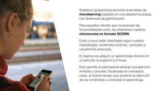 Snackson ofrece un catálogo de microcursos basados en el formato SCORM, enfocados en microlearning y gami fi cación, con un diseño visualmente atractivo y contenido directo. Los cursos abarcan diversas temáticas como gestión de tiempo, habilidades comunicativas, igualdad de género y ciberseguridad, cada uno con una dedicación recomendada de 30 minutos a 2 horas. El objetivo principal es facilitar un aprendizaje efectivo y aplicable en un tiempo limitado, optimizando la retención de información.