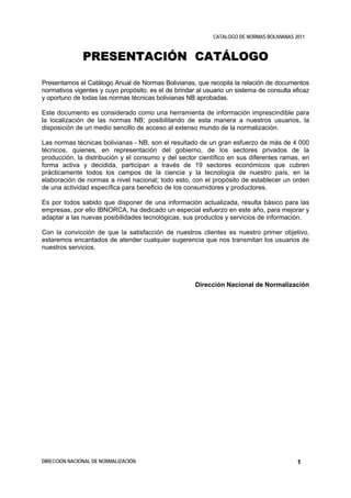 El catálogo anual de normas bolivianas 2011 compila y proporciona acceso a las normas técnicas vigentes en Bolivia, elaboradas por más de 4,000 técnicos en diversas áreas de la ciencia y tecnología. IBNORCA, como organismo responsable de normalización, facilita esta información para mejorar la calidad y competitividad en el país. Además, el catálogo se organiza por temas, permitiendo una búsqueda eficiente, y presenta detalles sobre cómo adquirir las normas y las formas de pago disponibles.