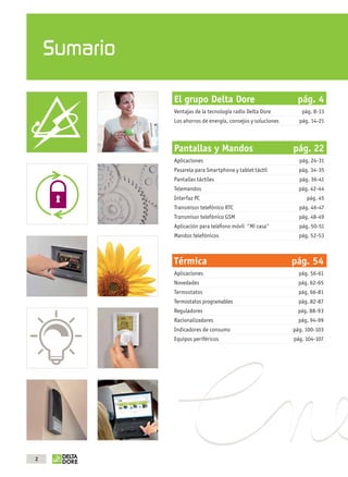 Este documento presenta las diferentes soluciones de Delta Dore para la gestión de la energía, los automatismos y la seguridad en el hogar y el terciario. Describe las ventajas de la tecnología radio de Delta Dore, incluyendo su fiabilidad, alcance y capacidad de controlar e integrar diferentes dispositivos. También explica cómo estas soluciones pueden ayudar a ahorrar energía a través de la programación y regulación de sistemas como la calefacción y la iluminación.