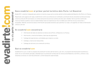 Este documento presenta el portal turístico evadirte.com, el primer portal turístico de las regiones de els Ports y el Maestrat. El portal ofrece información turística de la zona, reservas de hoteles y actividades, y servicios de promoción para empresas turísticas locales. El objetivo es promover el turismo sostenible en la región y ofrecer un canal para que las empresas locales promocionen y comercialicen sus servicios.