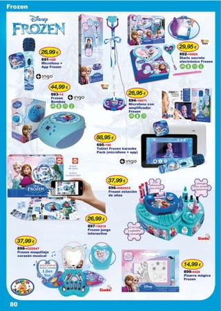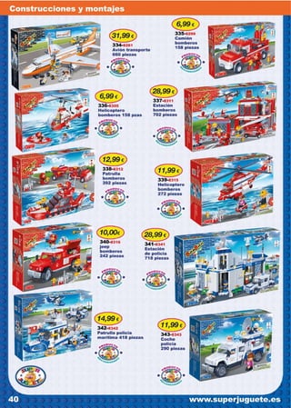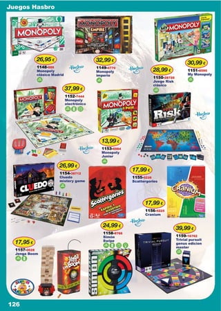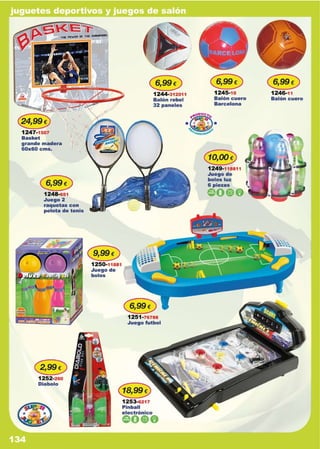 Este documento presenta una lista de juguetes para niños de diferentes edades, incluyendo detalles como el código de producto, nombre, edad recomendada y precio de cada artículo. Los juguetes están organizados en categorías como primeros años, figuras y transformables, conjuntos de animales y más. Adicionalmente, anuncia un programa de vales de descuento.