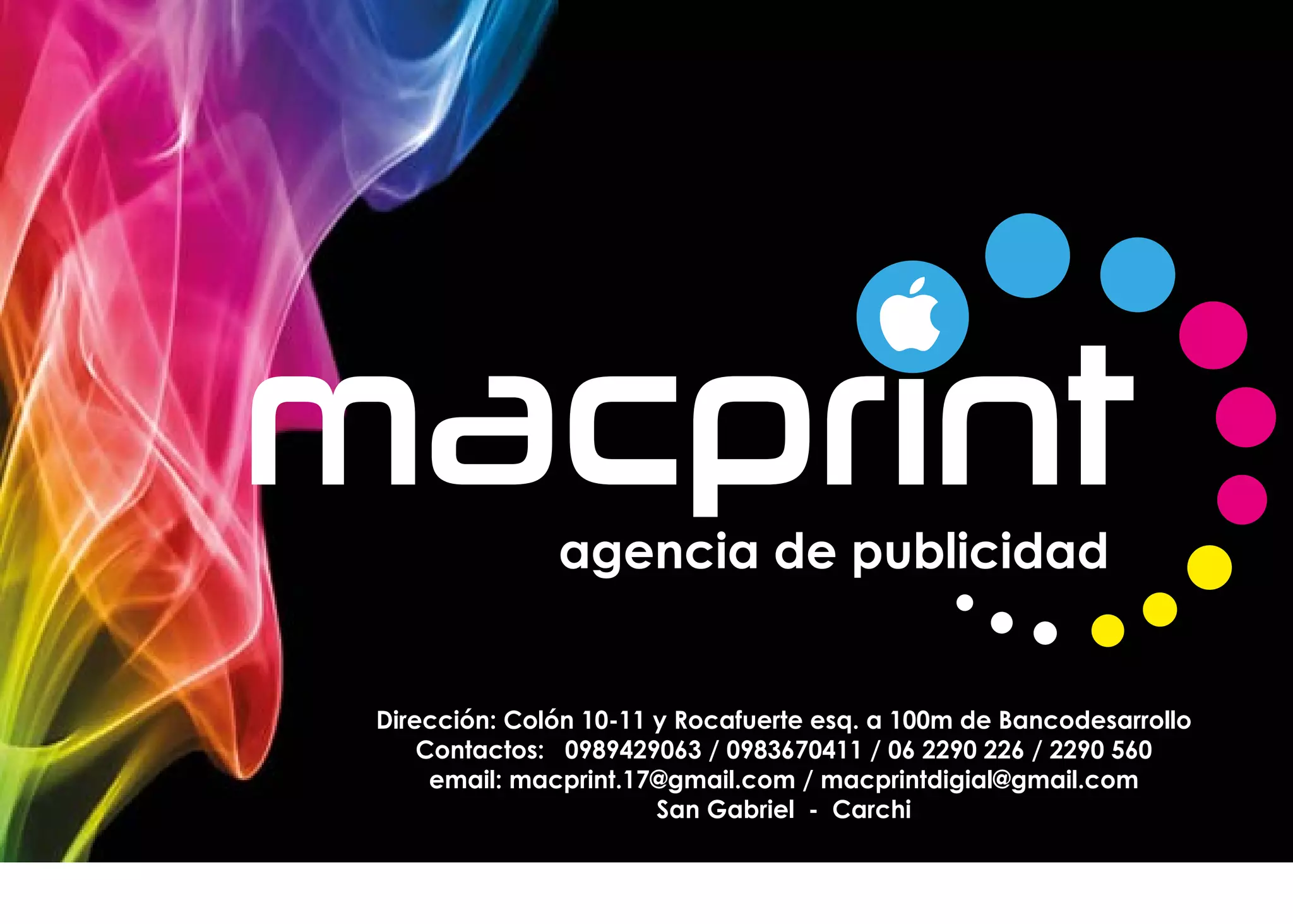 MacPrint es una agencia publicitaria en San Gabriel, Carchi, Ecuador que ofrece una variedad de servicios de diseño gráfico, impresión y publicidad desde 2010. Ofrecen diseño de páginas web, logotipos, impresión en vinil, banners, señalización, artículos promocionales y más, con el objetivo de conectar a las marcas con los consumidores a través de ideas creativas y soluciones personalizadas.