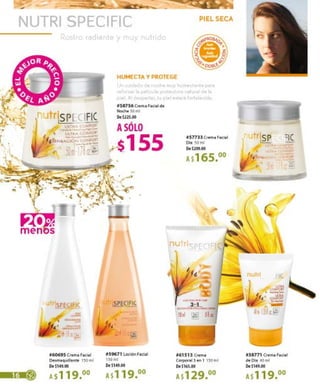 Este documento describe varios productos de belleza para el cuidado de la piel y maquillaje. Ofrece detalles sobre las características y beneficios de una crema facial humectante y reparadora, correctores de imperfecciones, lápiz labiales, rímel, y sombras de ojos en polvo. Recomienda aplicar los productos por la mañana y noche para reconstruir y nutrir la piel.
