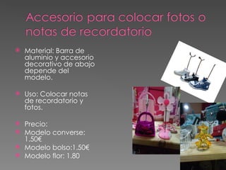 Este documento contiene información sobre varios productos como portafotos de aluminio, cajas decorativas, mermeladas, confituras, dulces típicos de Granada y aceites esenciales. Proporciona detalles sobre los materiales, usos y precios de cada producto.