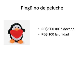 El documento es un catálogo de productos para San Valentín de Carlina G. Morati, que incluye una variedad de artículos como peluches, cajas de regalo, golosinas y decoraciones. Los precios de los productos varían, desde RD$ 10.00 hasta RD$ 1800.00, y se ofrecen en diferentes cantidades y diseños. Se proporciona información detallada sobre cada producto disponible, incluyendo su costo por unidad y por docena.
