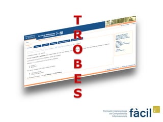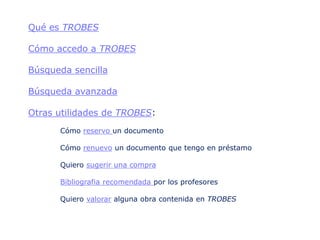 TROBES es el catálogo en línea de la Universitat de València que reúne todos los recursos de las bibliotecas universitarias independientemente de su formato u ubicación. El documento describe cómo acceder a TROBES y realizar búsquedas simples y avanzadas, y explica otras utilidades como reservar documentos, renovar préstamos, sugerir compras y valorar recursos.
