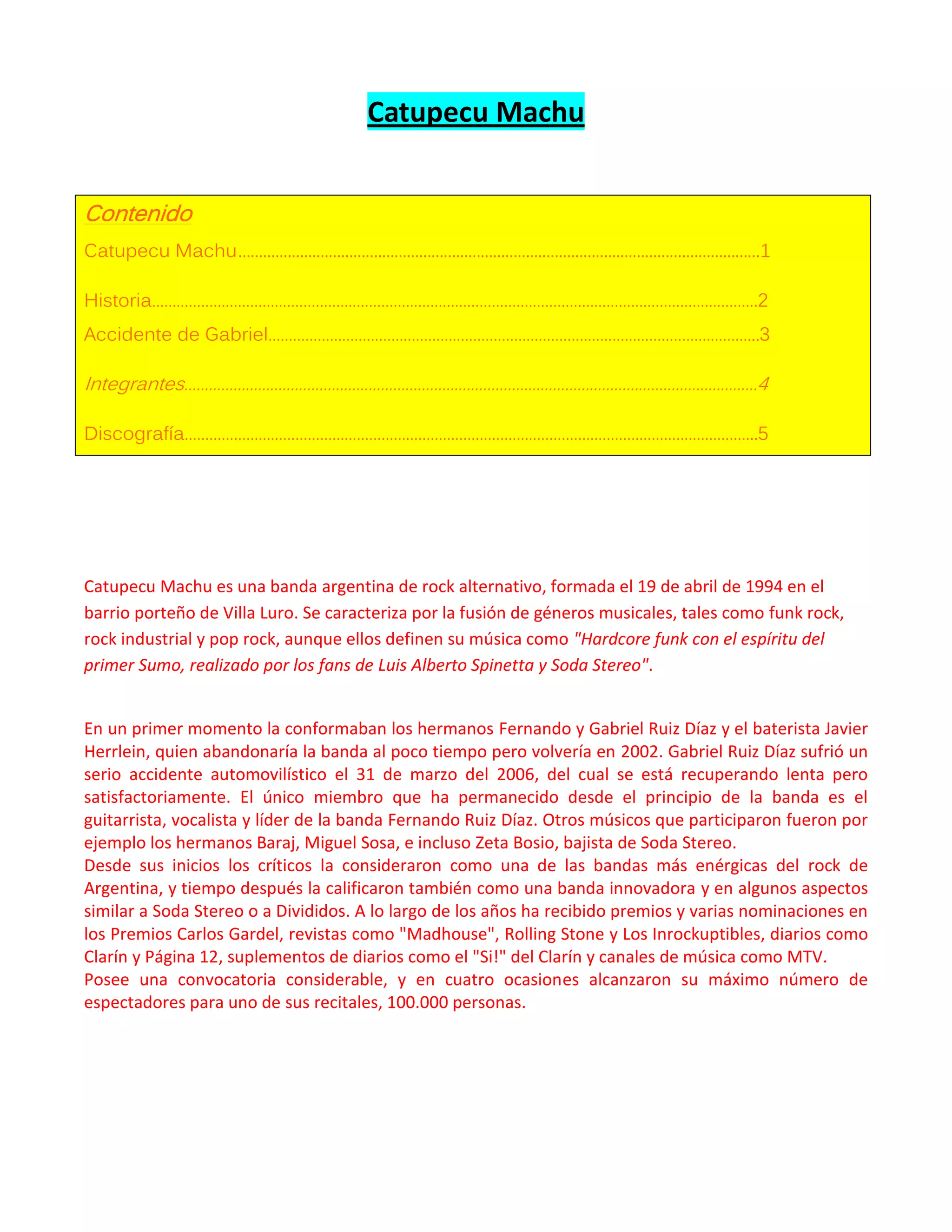 Catupecu Machu es una banda argentina de rock formada en 1994. Se caracteriza por fusionar géneros como funk rock, rock industrial y pop rock. La banda ha sufrido cambios de integrantes a lo largo de los años y uno de sus miembros, Gabriel Ruiz Díaz, sufrió un grave accidente automovilístico en 2006 del cual se está recuperando. Catupecu Machu ha lanzado siete álbumes de estudio desde 1997.